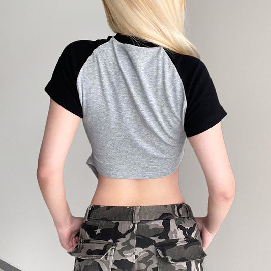 Women's Spice Slim-fit Short Color Bump Shoulder T-shirt Design Sense Asymmetrical Crop Hollow Letter Top