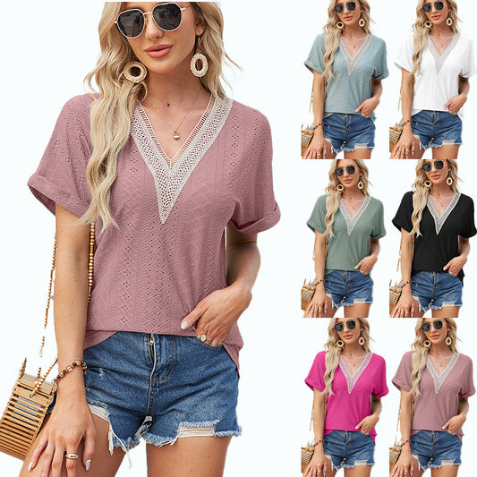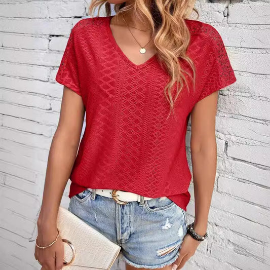 Women's Solid Color And V-neck Top Hollow Mesh Short Sleeve