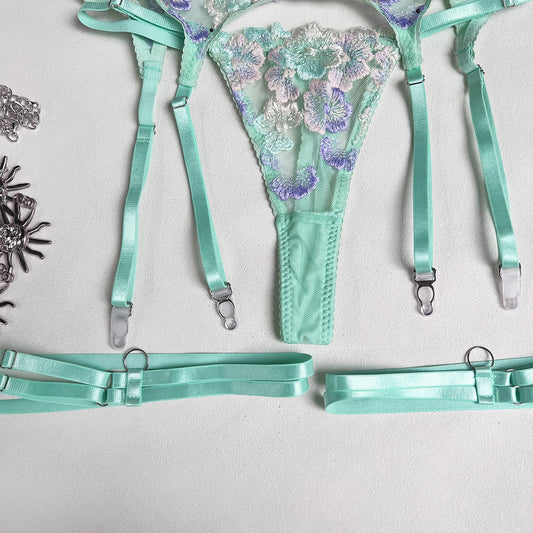 Lace Embroidery See-through Garter Three-piece Underwear Set